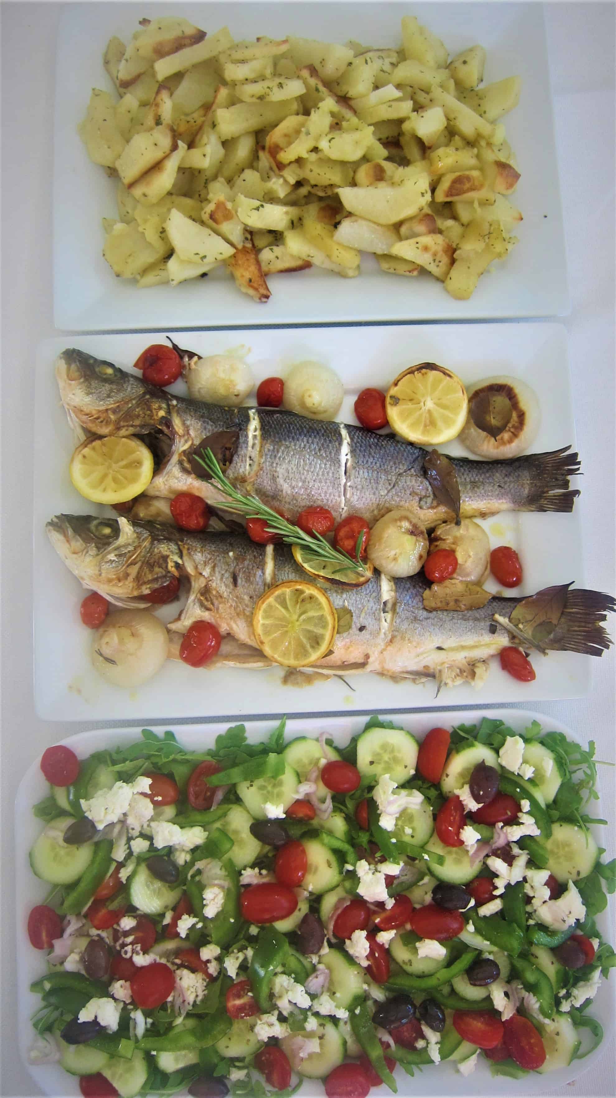 As warmer days are getting closer, I often remember the beach vacations we took as a family during summer time. Those were fun, simple & careless days spent by the water, playing soccer or volleyball barefoot in the sand. My native country, Albania is a small country with a beautiful shoreline in the middle of the Mediterranean. It has access to both Adriatic and Ionian Seas. Thus, seafood especially during summer time is abundant. I wanted to bring to you a recipe for Baked Mediterranean Branzino (Sea-Bass) as well as some typical Mediterranean side dishes that go with it. Hope you enjoy this Mediterranean meal:)