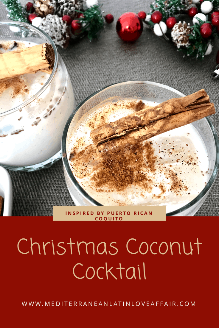 This Christmas Coconut Cocktail is the perfect holiday drink. It is inspired by Puerto Rican Coquito and this version has no egg yolks. Cheers / Salud 🙂