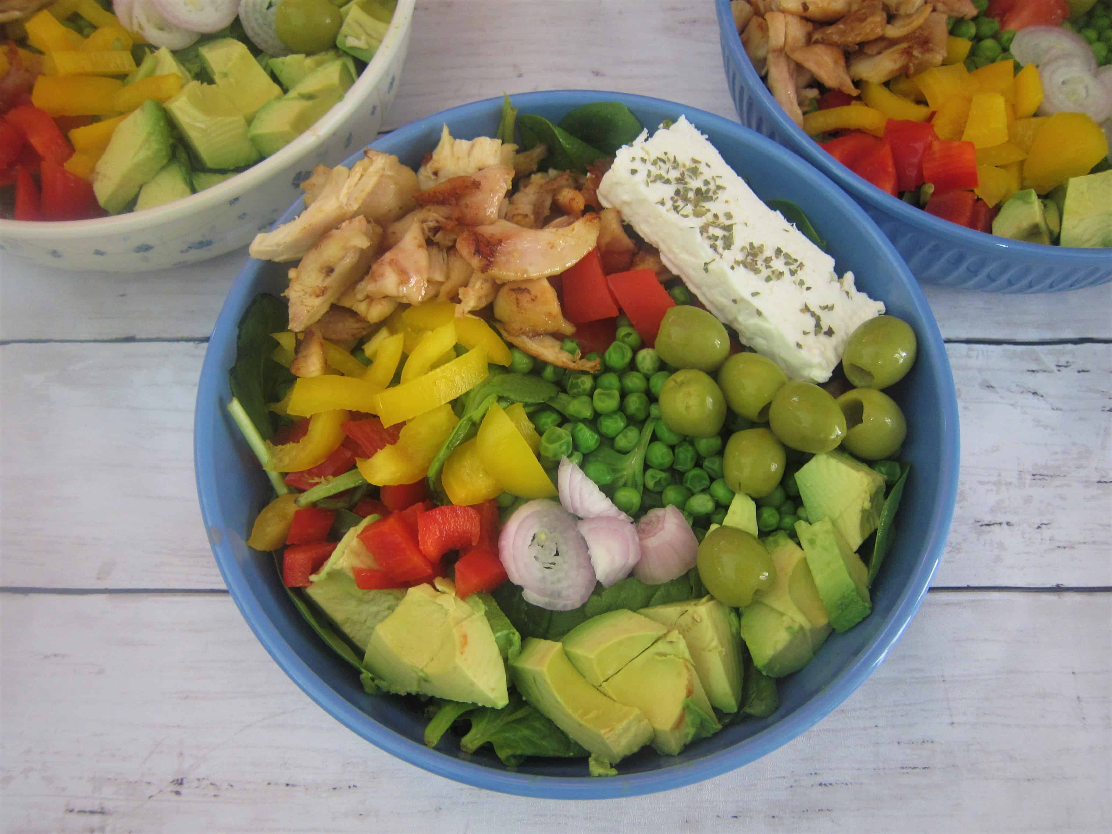 - Chop tomatoes, avocados, red and yellow pepper, onion and arrange in each individual salad bowl.